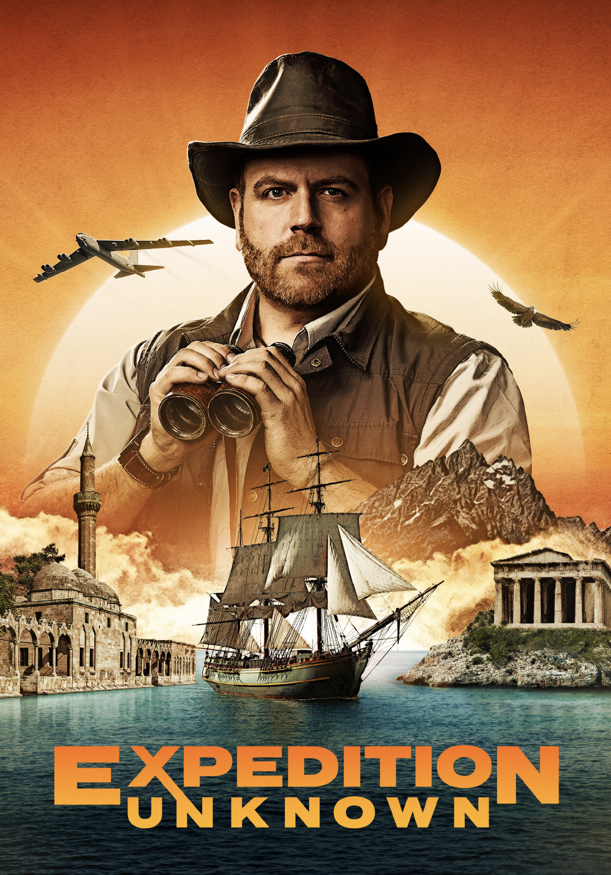 Poster for Expedition Unknown showing a man with a hat holding binoculars, with a ship, mountains, a mosque, an ancient temple, and birds in the background, and the title at the bottom.