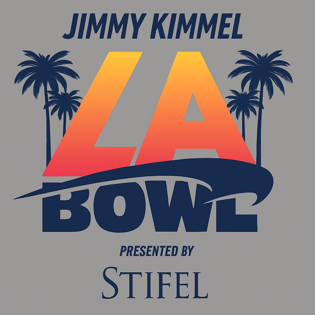 Logo for Jimmy Kimmel LA Bowl, presented by Stifel, featuring palm trees and a gradient large letter 'LA' on a gray background. Jimmy Kimmel LA Bowl Creator. Jimmy Kimmel LA Bowl Original idea