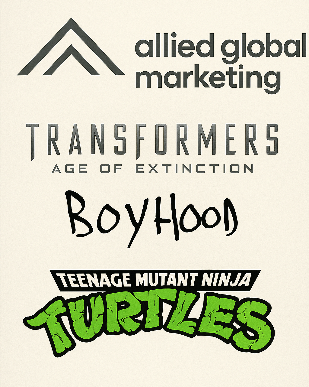 A promotional poster combining logos and names of various pop culture brands: Allied Global Marketing, Transformers: Age of Extinction, Boy Hool, Teen Mutant Ninja Turtles.